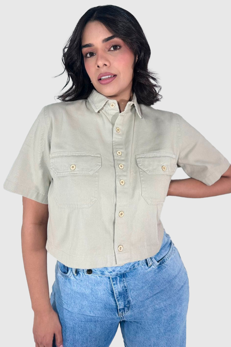 Cheia de personalidade e estilo, essa camisa cropped jeans na cor laranja vibrante é a peça ideal para quem ama montar looks casuais com atitude.