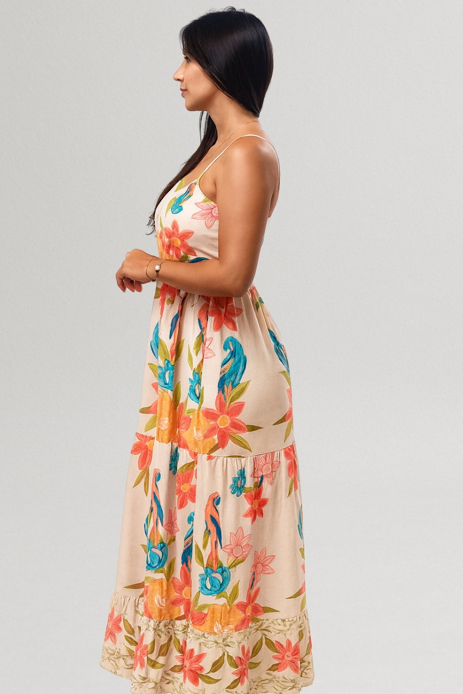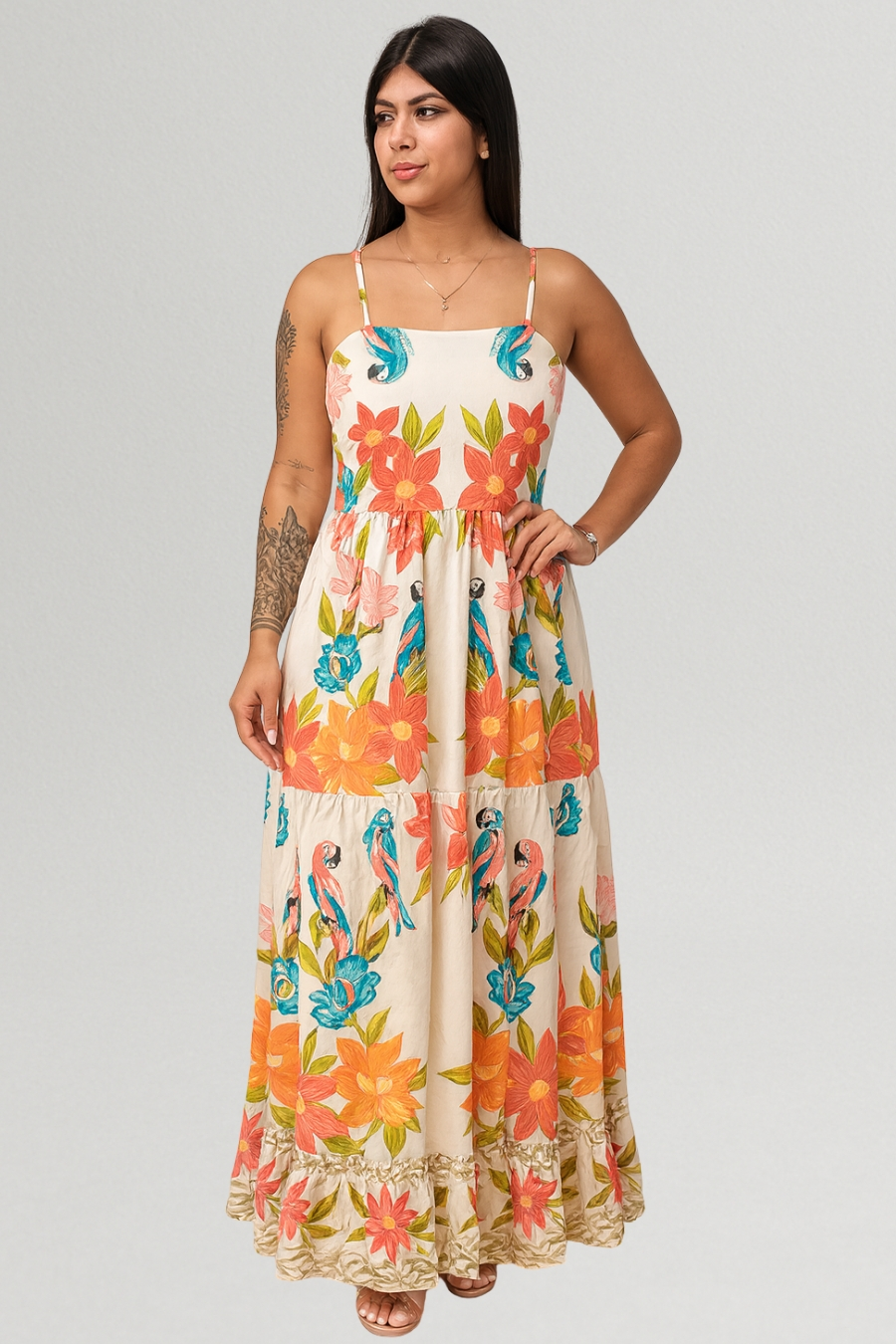 Com estampa tropical de flores e araras em tons vibrantes, a peça transmite alegria e sofisticação. Possui alças finas, decote reto e cintura levemente ajustada, valorizando a silhueta sem perder o conforto.