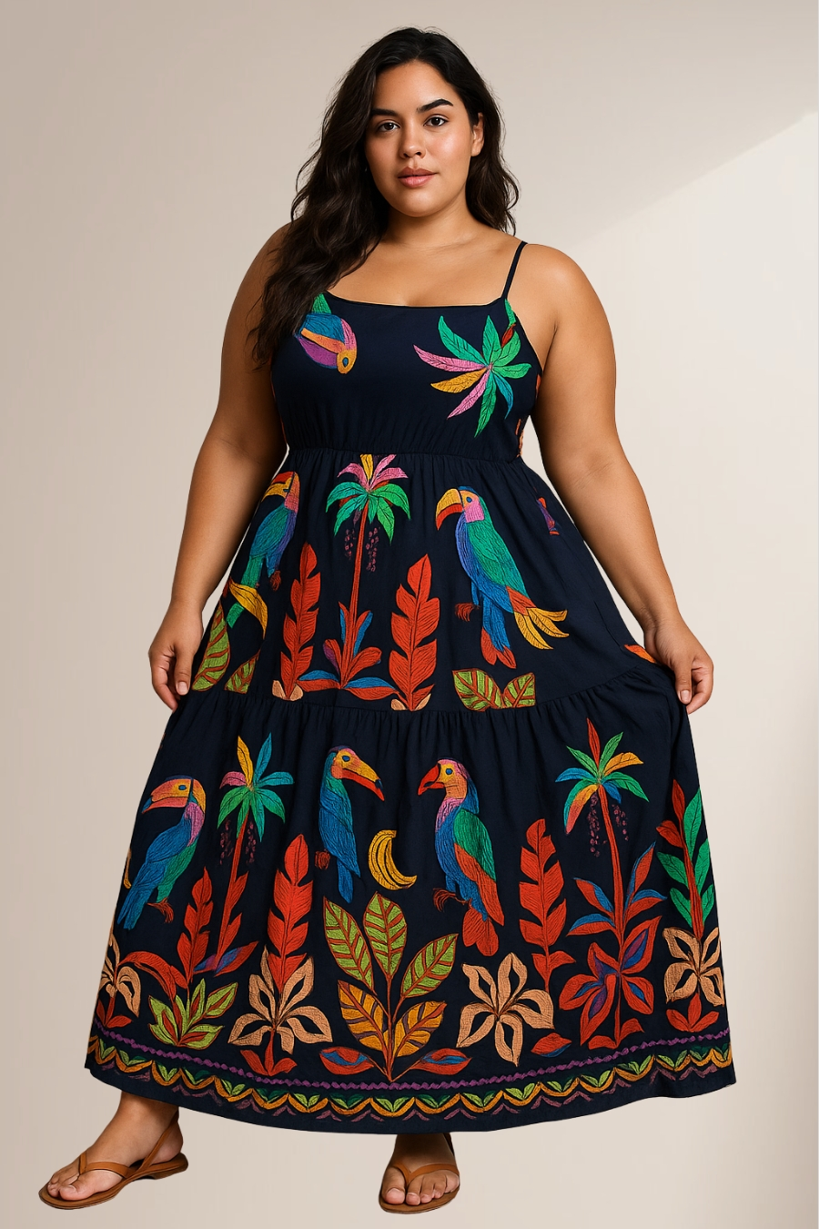 A estampa exclusiva traz tucanos, folhagens e elementos tropicais em cores vibrantes, que valorizam o visual e tornam a peça perfeita para momentos especiais, viagens, passeios ou eventos ao ar livre.